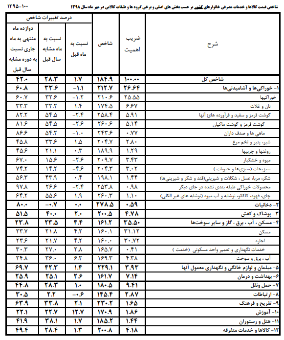 مرکز آمار ایران جزییات تغییرات قیمت ۱۲ گروه اصلی کالایی و مصرفی خانوار در مهرماه ۹۸ را اعلام کرد.