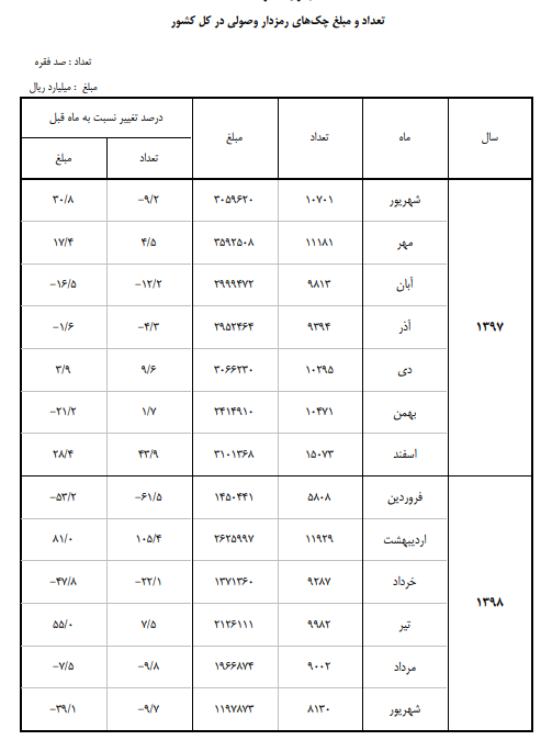 بالغ بر ٧ میلیون و ۶۰۰ فقره چک در شهریورماه ١٣٩٨ در کل کشور وصول شد که از این تعداد حدود ٦ میلیون و ۸۰۰ فقره عادی و بالغ بر ۸۰۰ هزار فقره رمزدار بوده است. بر این اساس در کل کشور ۸۹.۳ درصد از کل تعداد چکهای وصولی، عادی و ۱۰.۷ درصد رمزدار بوده است.
