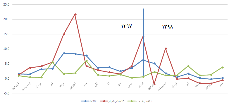 شاخص کالاهای بادوام نسبت به شاخص کل کالا، رابطه بیشتری با نرخ ارز داشته و با افزایش نرخ ارز در شهریور ماه ۱۳۹۷ بیشترین نرخ تورم ماهانه را ثبت کرده به گونه‌ای که این شاخص تنها در این ماه ۲۱.۷ درصد رشد داشته است. در ادامه با کاهش نرخ ارز، شاخص این گروه نیز روند کاهشی گرفته و در سه ماهه اخیر همواره با نرخ رشد منفی مواجه بوده است. همانطور که در نمودار ۱ مشخص است، نرخ رشد شاخص قیمت مصرف کننده در سال ۱۳۹۷، بیشتر از ناحیه شاخص کالا بوده و شاخص خدمت متناسب با آن رشد پیدا نکرده است. بنابراین در سال ۱۳۹۸ در حالیکه کاهش نرخ ارز موجب کاهش شاخص کالا و به خصوص کالاهای بادوام شده اما شاخص خدمت در حال تعدیل با شاخص کالا بوده و موجب افزایش شاخص کل شده است. بنابراین اثر کاهش نرخ ارز بر شاخص کالا به خوبی نمایان است.