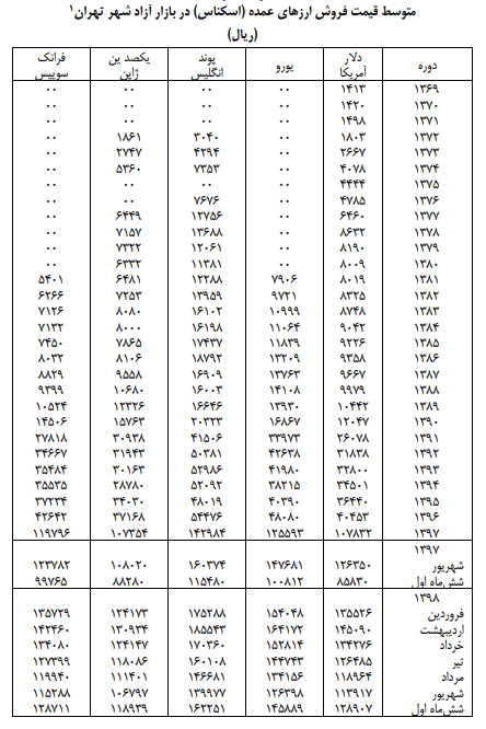 در شش ماه اول سال ١٣٩٨ متوسط قیمت فروش یک دلار آمریکا و یک یورو در بازار آزاد شهر تهران به ترتیب ۱۲ هزار و ۸۹۰ تومان و ۱۴ هزار و ۵۸۸ تومان بوده است. متوسط قیمت فروش سایر ارزهای عمده در جداول زیر نشان داده شده است.