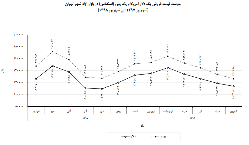 همچنین در شهریور ماه ١٣٩٨ متوسط قیمت فروش یک یورو در بازار آزاد شهر تهران ۱۲ هزار و ۶۳۹ تومان بود که در مقایسه با ماه قبل و ماه مشابه سال قبل به ترتیب ۵.۸ و ۱۴.۴ درصد افزایش داشته است. همچنین حداقل و حداکثر نرخ فروش یک یورو در ماه مذکور به ترتیب ۱۲ هزار و ۳۶۳ تومان و ١۳ هزار و ۳۴ تومان بوده است.