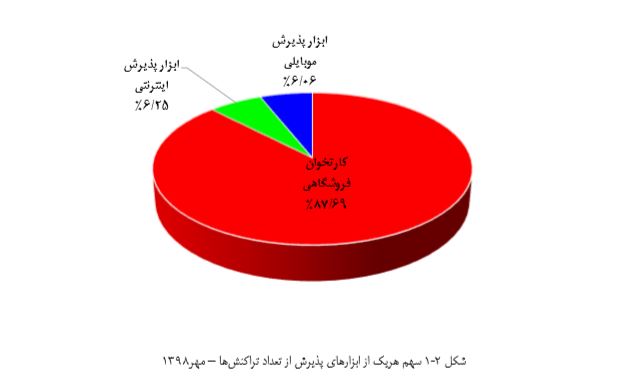 بر اساس گزارش شرکت شاپرک بالغ بر ۸۷.۶۹ درصد از تراکنشها از طریق پایانههای فروش (کارتخوان) و سهم ابزار پذیرش اینترنتی و موبایلی به ترتیب ۶.۲۵ و ۶۰۶ درصد بوده است؛ گزارش شاپرک در خصوص سهم ابزارهای پذیرش از نظر تعداد تراکنشها نشان میدهد که ابزار کارتخوان فروشگاهی به عنوان رایجترین ابزار پذیرش در کشور نسبت به ماه گذشته ۰.۱۰ درصد افزایش سهم داشته است.