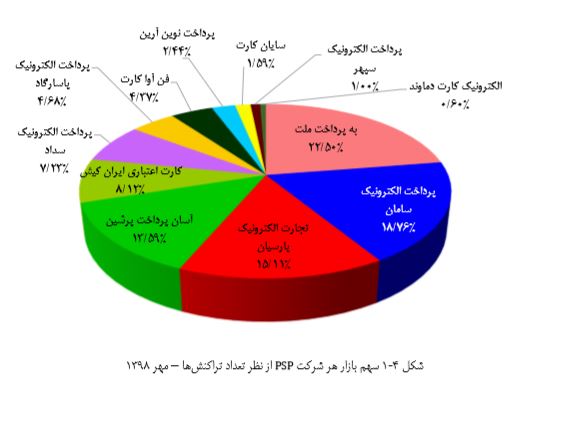 گزارش شاپرک در خصوص سهم شرکتهای پرداخت الکترونیک از نظر تعداد تراکنش در مهر ماه ۹۸ حاکی از آن است که شرکتهای به پرداخت ملت با ۲۲.۵۰ درصد و پرداخت الکترونیک سامان با ۱۸.۷۶ درصد و تجارت الکترونیک پارسیان با ۱۵.۱۱ درصد توانستهاند جایگاه اول تا سوم بیشترین تعداد تراکنش در میان شرکتهای پرداخت را کسب کنند. لازم به ذکر است که مقایسه گزارش مهر ماه نسبت به شهریور ماه نشان میدهد که سهم بازار شرکتهای به پرداخت و تجارت، پرداخت الکترونیک سامان، الکترونیک پارسیان همچنان دارای رشد است و پرداخت الکترونیک سامان به ثباتی نسبی رسیده است؛ از سویی دیگر کمترین میزان تراکنش در میان شرکتهای پرداخت متعلق به شرکت الکترونیک کارت دماوند با سهم ۰.۶۰ درصدی از تعداد تراکنشهای شاپرکی انجام شده است و پس از آن نیز پرداخت الکترونیک سپهر بالغ بر یک درصد از تمام تراکنشهای شبکه شاپرک را به خود اختصاص داده است.