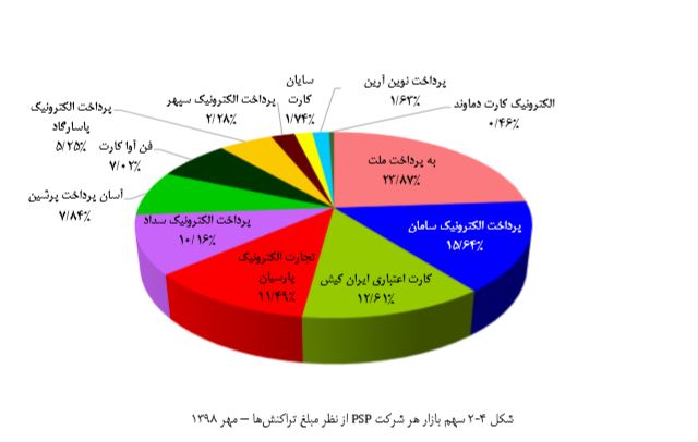 نمودار سهم بازار شرکتهای پرداخت الکترونیک در خصوص مبلغ تراکنشهای شاپرکی در مهر ماه نشان میدهد که به پرداخت ملت بالغ بر ۲۳.۸۷ درصد از مبلغ تراکنشهای شاپرکی را به خود اختصاص داده و در جایگاه نخست قرار گرفته است؛ در ادامه نیز پرداخت الکترونیک سامان و کارت اعتباری ایران کیش به ترتیب با سهم ۱۵.۶۴ و ۱۲.۶۱ در جایگاه دوم و سهم قرار دارند؛ مقایسه نمودار تعداد و مبلغ تراکنشهای شاپرکی مهر ماه در سهم بازار شرکتهای پرداخت الکترونیک نشان میدهد که شرکت تجارت الکترونیک پارسیان که جایگاه سوم را با سهم ۱۵.۰۸ درصدی در تعداد تراکنشها به خود اختصاص داده، در زمینه مبلغ تراکنشها جایگاه چهارم را با سهمی ۱۱.۴۹ درصدی دارد و از سویی دیگر شرکت کارت اعتباری ایران کیش که در زمینه تعداد تراکنشهای شاپرکی مهر ماه سهمی ۸.۱۲ درصدی و جایگاه پنجم را داشته، در سهم بازار از نظر مبلغ تراکنش با برخورداری از تراکنشهایی با مبالغ بالاتر توانسته تا با با سهم ۱۲.۶۱ درصدی در جایگاه سوم قرار بگیرد.