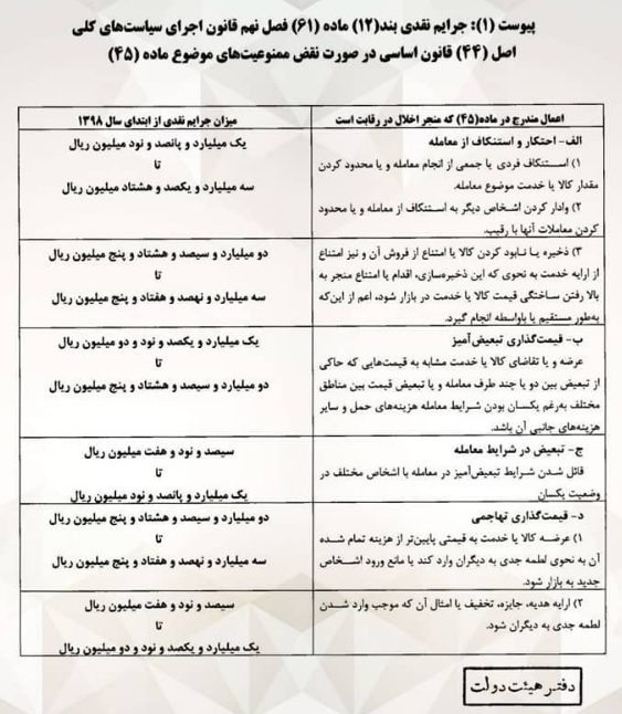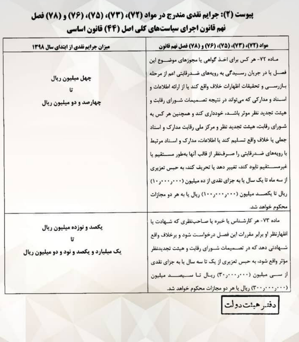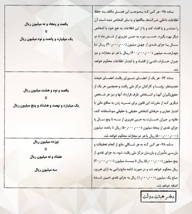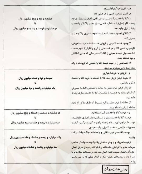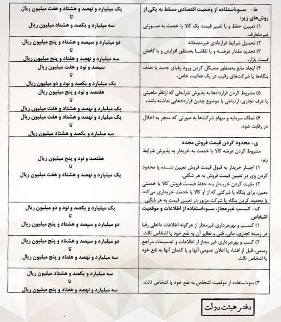 گفتنی است، مبالغ جزای نقدی مندرج در این فصل هر سه سال یک بار متناسب با رشد شاخص بهای کالاها و خدمات مصرفی که توسط بانک مرکزی جمهوری اسلامی ایران به طور رسمی اعلام میشود، با پیشنهاد شورای رقابت و تصویب هیأت وزیران تعدیل میشود.