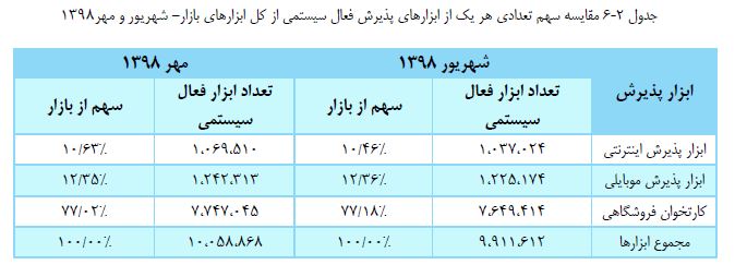 این گزارش نشان میدهد که تعداد ابزارهای پذیرش فعال در شبکه پرداخت الکترونیک از جمله ابزار پذیرش اینترنتی، ابزار پذیرش موبایلی و کارتخوان فروشگاهی در مهر ماه نسبت به شهریور ماه از رشد خوبی به خصوص در بخش ابزار پذیرش اینترنتی برخوردار بوده تا جایی که تعداد مجموع ابزارهای فعال در شبکه پرداخت ایران به ۱۰ میلیون و ۵۸ هزار و ۸۶۸ ابزار رسیده است که نسبت به شهریورماه و تعداد ۹ میلیون و ۹۱۱ هزار ابزار پذیرش دچار رشدی ۱.۴۹ درصدی شده است.
