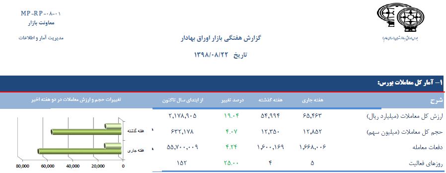بر اساس اطلاعات منتشر شده، در ۵ روز کاری هفته گذشته، ارزش کل معاملات اوراق بهادار به ۶۵.۴۶۳ میلیارد ریال بالغ شد که نسبت به هفته قبل ۱۹ درصد افزایش یافت.