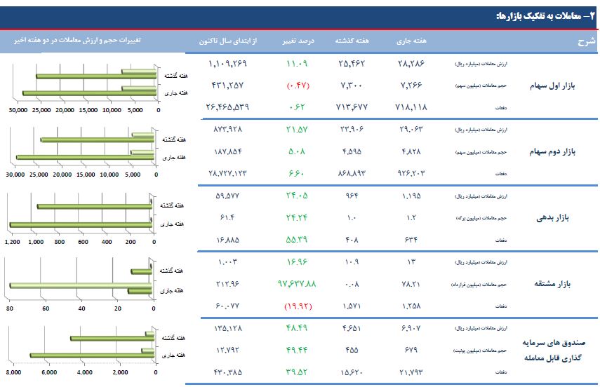در ضمن تعداد ۱۲.۸۵۲ میلیون انواع اوراق بهادار در بیش از یک میلیون و ۶۶۸ هزار دفعه مورد معامله قرار گرفت و به ترتیب ۴.۰۷ درصد و ۴.۲۴ درصد افزایش را نسبت به هفته گذشته تجربه کردند.