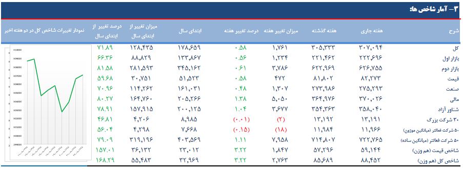 افزون بر این در هفته گذشته، شاخص بازار اول با ۱.۲۳۴ واحد افزایش به ۲۲۲.۶۹۶ و شاخص بازار دوم با ۳.۷۸۶ افزایش به ۶۲۶.۷۵۵ واحد رسید که به این ترتیب شاخص بازار اول با ۰.۵۶ درصد و شاخص بازار دوم با ۰.۶۱ درصد افزایش نسبت به هفته قبل همراه شدند.