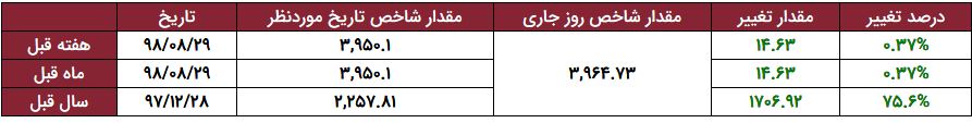 بر این اساس شاخص فرابورس(آیفکس) در آخرین روز کاری آبان ماه در ارتفاع ۳۹۵۰ واحدی ایستاد که نشان از رشد ۱۴۵ واحدی معادل ۴ درصد داشت. همچنین ارزش بازار فرابورس با رشد ۷ درصدی نسبت به روز پایانی ماه قبل به بیش از رقم چهار میلیون و ۱۲۵ هزار میلیارد ریال رسید که بازدهی ۶۰ درصدی را از آغاز سال ۹۸ نشان میدهد.