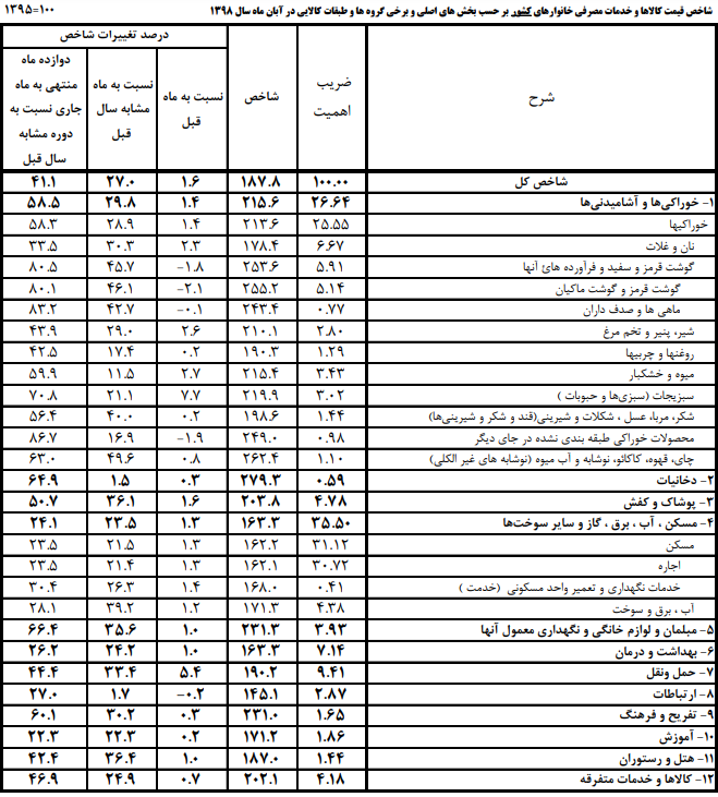 همچنین طبق گزارش تهیه شده شاخص قیمت کالاها در ۱۲ ردیف به تفکیک اعلام شده که بر این اساس، شاخص قیمتی خوراکیها و آشامیدنیها در آبان ماه نسبت به ماه مشابه سال قبل ۲۹.۸ درصد و در دوازده ماه منتهی به ماه جاری نسبت به دوره مشابه سال قبل ۵۸.۵ درصد رشد داشته است.