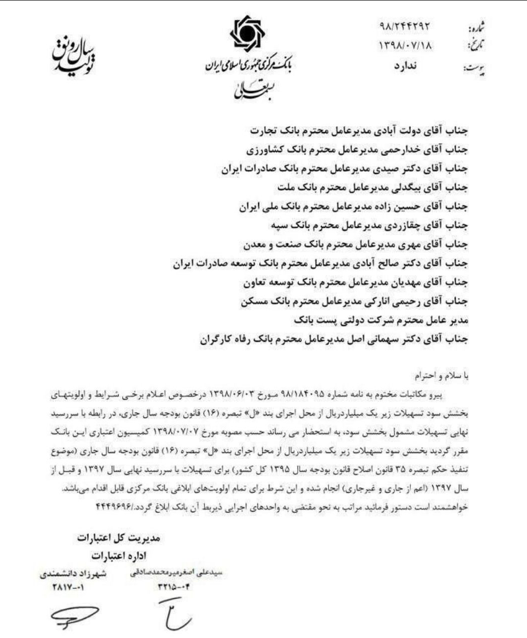 به گزارش خبرنگار ایبِنا، بر اساس بخشنامه بانک مرکزی، سررسید تسهیلات مشمول بخشش سود و جرایم از محل اجرای بند (ل) تبصره ۱۶ قانون بودجه سال ۱۳۹۸ که پیش از این صرفا تا پایان سال ۹۵ اعلام شده بود به تسهیلات مشمول سررسید شده تا سال ۹۷ و پیش از آن و اعم از تسهیلات جاری و غیر جاری تا سقف ۱۰۰ میلیون تومان تعمیم یافت.