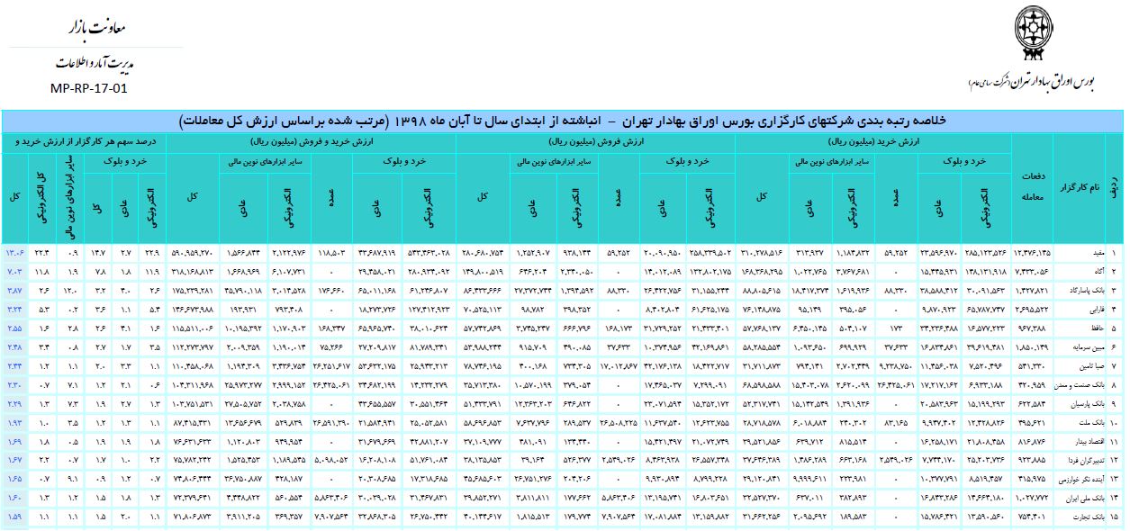 بر اساس این گزارش، رتبه بندی عملکرد کارگزاری ها که از سوی بورس اوراق بهادار تهران اعلام شده مشخص می کند که در این دوره زمانی «از ابتدای سال جاری تا پایان آبان ماه» شرکت های کارگزاری «مفید با ۱۳.۰۶ درصد، کارگزاری آگاه با ۷.۰۳ درصد، کارگزاری بانک پاسارگاد با ۳.۸۷ درصد، کارگزاری فارابی با ۳.۲۴ درصد، کارگزاری حافظ با ۲.۵۵ درصد، کارگزاری مبین سرمایه با ۲.۴۸ درصد، کارگزاری صبا تامین با ۲.۴۴ درصد، کارگزاری بانک صنعت و معدن با ۲.۳۰ درصد، کارگزاری بانک پارسیان با ۲.۲۹ درصد، کارگزاری بانک ملت با ۱.۹۳ درصد، کارگزاری اقتصاد بیدار با ۱.۶۹ درصد، کارگزاری تدبیرگران فردا با ۱.۶۷ درصد، کارگزاری آینده نگر خوارزمی با ۱.۶۵ درصد، کارگزاری بانک ملی با ۱.۶۰ درصد و کارگزاری بانک تجارت با ۱.۵۹ درصد» در رتبه های اول تا پانزدهم برترین کارگزاری ها از نظر کل ارزش معاملات قرار دارند.