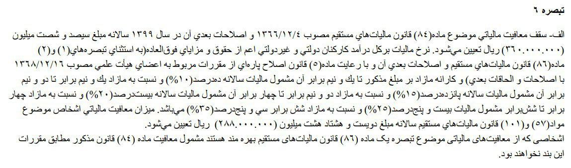 به گزارش ایبِنا، براساس تبصره ۶ لایجه بودجه ۹۹، سقف معافیت مالیاتی موضوع ماده (٨٤ (قانون مالیات های مستقیم مصوب ۴/ ۱۲/ ۱۳۶۶ و اصلاحات بعدی آن در سال ١٣٩٩ سالانه مبلغ سالانه مبلغ سیصد و شصت میلیون (۳۶۰.۰۰۰.۰۰۰ ) ریال میشـود.