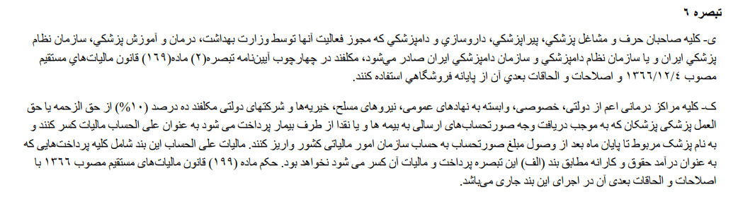 به گزارش ایبِنا در بند "ی" تبصره ۶، کلیه صاحبان حرف و مشاغل پزشکی، پیراپزشکی، داروسازی و دامپزشکی که مجوز فعالیت آنها توسط وزارت بهداشت، درمان و آموزش پزشکی، سازمان نظام پزشکی ایران و یا سازمان نظام دامپزشکی و سازمان دامپزشکی ایران صادر می‌شود، مکلفند در چهارچوب آیین‌نامه تبصره ٢ ماده(١٦٩ ) قانون مالیات‌های مستقیم مصوب ۴ /۱۲/ ۱۳۶۶ و اصلاحات و الحاقات بعدی آن از پایانه فروشگاهی استفاده کنند.
