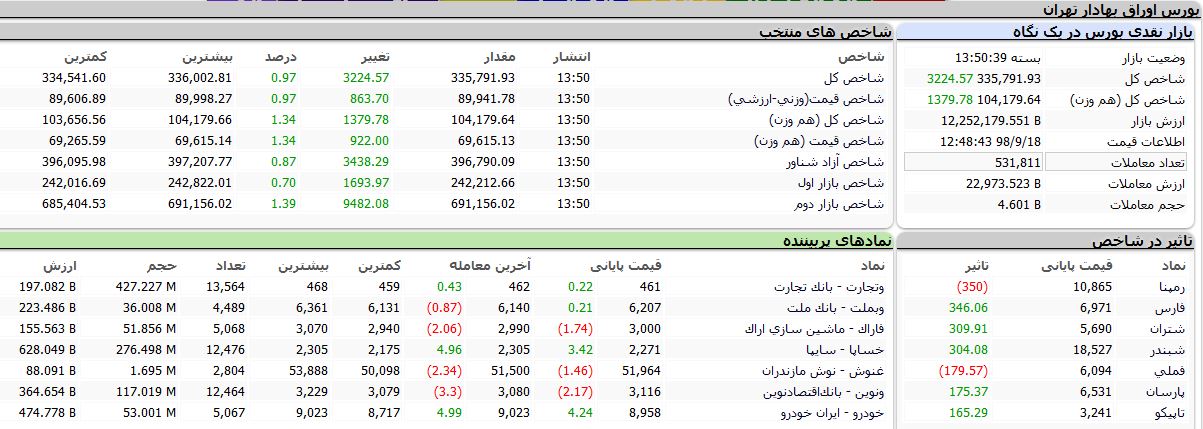 بر اساس آمارهای معاملاتی، روز جاری اکثر شاخصهای بورس با رشد مواجه شدند به طوری که شاخص کل با ۳۲۲۴ واحد رشد معادل ۰.۹۷ درصد به ۳۳۵ هزار و ۷۹۱ واحد، شاخص قیمت «وزنی - ارزشی» با ۸۶۳ واحد افزایش معادل ۰.۹۷ درصد به ۸۹ هزار و ۹۴۱ واحد، شاخص کل «هم وزن» با ۱۳۷۹ واحد رشد معادل ۱.۳۴ درصد به ۱۰۴ هزار و ۱۷۹ واحد، شاخص قیمت «هم وزن» با ۹۲۲ واحد افزایش، معادل ۱.۳۴ درصد به ۶۹ هزار و ۶۱۵ واحد، شاخص آزاد شناور با ۳۴۳۸ واحد رشد، معادل ۰.۸۷ درصد به ۳۹۶ هزار و ۷۹۰ واحد، شاخص بازار اول با ۱۶۹۳ واحد افزایش معادل ۰.۷۰ درصد به ۲۴۲ هزار ۲۱۲ واحد و شاخص بازار دوم با ۹۴۸۲ واحد رشد معادل ۱.۳۹ درصد، به ۶۹۱ هزار و ۱۵۶ واحد رسید.