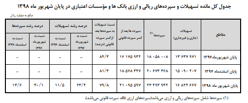 شایان ذکر است نسبت تسهیلات به سپردهها بعد از کسر سپرده قانونی ۷۹.۸ درصد است که نسبت به پایان شهریور ماه ۱۳۹۷ و پایان اسفند ۱۳۹۷، به ترتیب ۴.۵ و ۱.۵ واحد درصد کاهش نشان میدهد. نسبت مذکور در استان تهران ۹۴ درصد و در استان کهگیلویه و بویراحمد ۱۰۶.۶ درصد است.