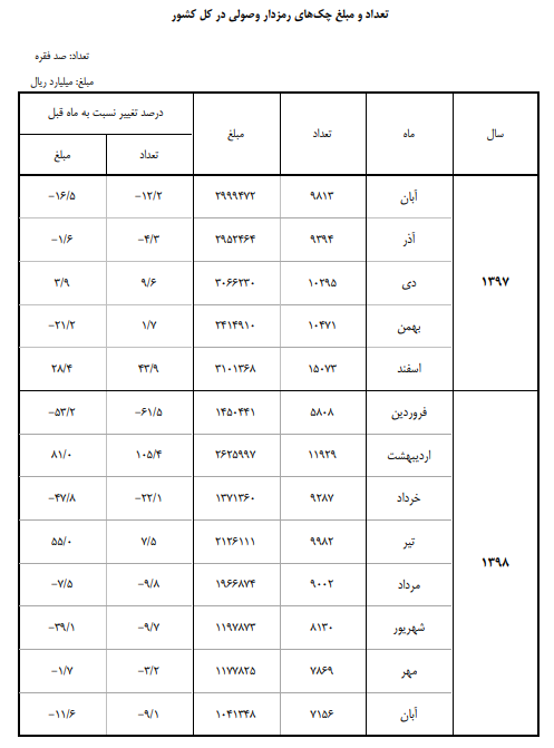 بالغ بر ٧ میلیون و ۶۰۰ هزار فقره چک در آبان ماه ١٣٩٨ در کل کشور وصول شد که از این تعداد بالغ بر ٦ میلیون و ۹۰۰ هزار فقره عادی و بالغ بر ۷۰۰ هزار فقره رمزدار بوده است. بر این اسـاس درکل کشور ۹۰.۶ درصد از کل تعداد چکهای وصولی، عادی و ۹.۴ درصد رمزدار بوده است. در ماه مورد بررسی در کل کشور حدود ١٧٧٧ هزار میلیارد ریال چک وصول گردید که حـدود ٧٣٦ هزار میلیارد ریال چک عادی و بالغ بر ١٠٤١ هزار میلیارد ریال چک رمزدار است. به عبارتی در کل کشور ۴۱.۴ درصد از کل ارزش چـکهای وصولی، عادی و ۵۸.۶ درصد رمزدار بوده است.