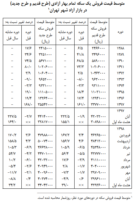 متوسط قیمت فروش یک سکه تمام بهار آزادی در هشت ماه اول سال ١٣٩٨ در بازار آزاد شهر تهران با طرح قدیم ۴ میلیون و ۲۹۳ هزار و ۶۰۰ تومان و با طرح جدید ۴ میلیون و ۴۰۴ هزار و ۳۰۰ تومان بود که نسبت به دوره مشابه سال ١٣٩٧ به ترتیب ۳۹ درصد و ۳۴.۲ درصد افزایش یافته است.