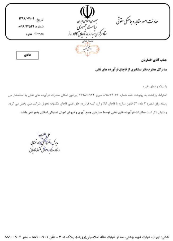 به گزارش خبرنگار ایبِنا، ستاد مرکزی مبارزه با قاچاق کالا و ارز در پاسخ به استعلامی اعلام کرد که صادرات فرآورده های نفتی توسط سازمان اموال تملیکی ممنوع است و کلیه فرآوردههای نفتی قاچاق مکشوفه باید تحویل شرکت ملی پخش شود.