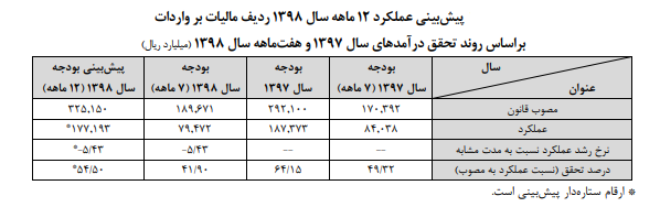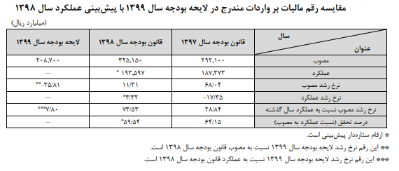 مطابق جدول زیر می‌توان عنوان کرد که رقم مالیات بر واردات در لایحه بودجه سال ۱۳۹۹ نسبت به رقم مصوب سال قبل منفی ۳۵.۸۱ درصد رشد داشته و نسبت به پیش‌بینی عملکرد سال ۱۳۹۸ نیز با رشد ۷.۸۰ درصدی مواجه بوده است.