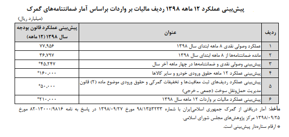 تخمین میزان مالیات بر واردات وصولی در پایان سال ۱۳۹۸