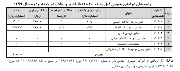 براساس اعداد مندرج در لایحه بودجه سال ۱۳۹۹ جمع کل درآمد (عمومی و اختصاصی) در نظر گرفته شده برای مالیات بر واردات ۲۰۸۷۰۰۵۰۰ میلیون ریال درج گردیده است که جمع ردیف عمومی مالیات بر واردات رقمی معادل ۲۰۰۰۰۰۰۰۵ میلیون ریال بوده و تجزیه رقم فوق براساس آمارهای اخذ شده از گمرک جمهوری اسلامی ایران متشکل از ۶ ردیف به شرح جدول ذیل است.