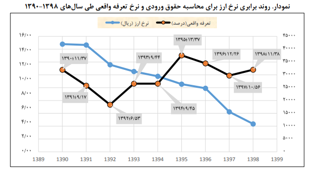 در ذیل متوسط نرخ حقوق ورودی اسمی و نرخ تعرفه واقعی ارائه گردیده است. همانگونه که ملاحظه می‌شود متوسط نرخ حقوق اسمی طی سال‌های ۱۳۹۷-۱۳۹۰ متناسب با افزایش نرخ برابری ارز بانک مرکزی جهت محاسبه حقوق ورودی روندی نزولی داشته اما نرخ تعرفه واقعی دارای روندی نامنظم می‌باشد. علاوه بر این مطابق جدول فوق طی سال‌های ۱۳۹۶-۱۳۹۰ عملکرد مالیات بر واردات روندی صعودی داشته و مجدد در سال ۱۳۹۷ عملکرد مالیات بر واردات روندی نزولی پیدا کرده است.