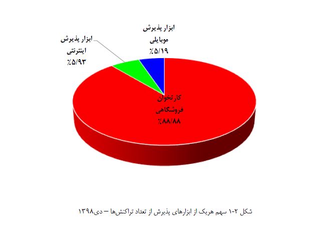بر اساس گزارش شرکت شاپرک بالغ بر ۸۸.۸۸ درصد از تراکنشهای دی ماه از طریق پایانههای فروش (کارتخوان) انجام شده و سهم ابزار پذیرش اینترنتی و موبایلی به ترتیب ۵.۹۳ و ۵.۱۹ درصد بوده است؛ گزارش شاپرک در خصوص سهم ابزارهای پذیرش از نظر تعداد تراکنشها نشان میدهد که ابزار کارتخوان فروشگاهی به عنوان رایجترین ابزار پذیرش در کشور نسبت به ماه گذشته ۰۷۲ درصد افزایش سهم داشته اما ابزار پذیرش موبایلی و اینترنتی با کاهش سهم از تعداد تراکنش روبرو بودهاند.