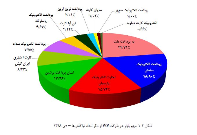 گزارش شاپرک در خصوص سهم شرکتهای پرداخت الکترونیک از نظر تعداد تراکنش در دی ماه ۹۸ حاکی از آن است که شرکتهای به پرداخت ملت با ۲۲.۷۱ درصد و پرداخت الکترونیک سامان با ۱۸.۸۰ درصد وتجارت الکترونیک پارسیان با ۱۵.۷۴ درصد توانستهاند جایگاه اول تا سوم بیشترین تعداد تراکنش در میان شرکتهای پرداخت را کسب کنند؛ از سویی دیگر کمترین میزان تراکنش در میان شرکتهای پرداخت متعلق به شرکت الکترونیک کارت دماوند با سهم ۰.۶۶ درصدی از تعداد تراکنشهای شاپرکی انجام شده و پس از آن نیز پرداخت الکترونیک سپهر بالغ بر یک درصد از تمام تراکنشهای شبکه شاپرک را به خود اختصاص داده است.