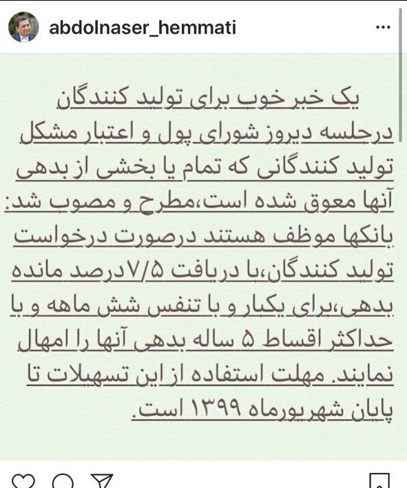 به گزارش ایبِنا، رییس کل بانک مرکزی در یادداشتی اینستاگرامی خبر خوبی برای تولیدکنندگان درباره امهال بدهی آنها اعلام کرد.