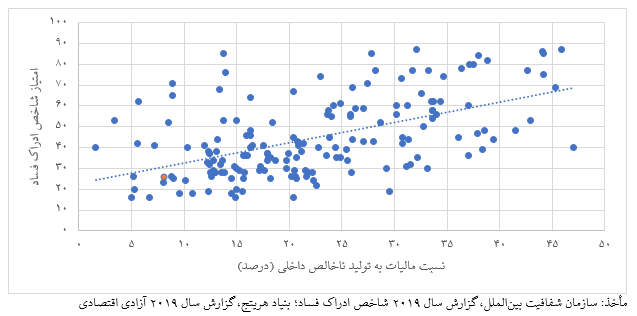 با بهبود امتیاز شاخص اداراک فساد، نسبت مالیات به تولید ناخالص داخلی در کشورها افزایش مییابد. ایران با نسبت مالیات به تولید ناخالص داخلی ۸ درصدی، تنها امتیاز ۲۶ را در شاخص ادراک فساد کسب کرده و پایینتر از خط روند قرار گرفته است.