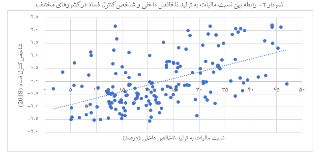 شاخص دیگری که برای ارزیابی وضعیت فساد در کشورها مورد استفاده قرار میگیرد، شاخص کنترل فساد است که از سوی بانک جهانی و در زیرمجموعه شاخصهای حکمرانی جهانی محاسبه و منتشر میشود. نمودار ۲ رابطه بین این شاخص و نسبت مالیات به تولید ناخالص داخلی را در کشورهای مختلف جهان نشان میدهد. دایره نارنجی رنگ نشاندهنده وضعیت ایران است. مشابه شاخص ادراک فساد، شاخص کنترل فساد نیز رابطه مستقیمی با نسبت مالیات به تولید ناخالص داخلی دارد و در این زمینه نیز ایران پایینتر از خط روند قرار میگیرد.