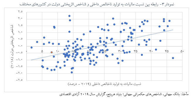 جدای از اعتماد عمومی به توانایی دولت در کنترل فساد، مردم برای پرداخت مالیات باید به کارآمدی مخارج دولتی نیز اعتماد داشته باشند. حتی اگر دولتی بدون فساد و در شفافیت کامل نسبت به تخصیص مخارج عمومی اقدام کند، تا زمانی که این مخارج در اموری مصرف شود که خواسته واقعی مردم نیست یا به نحوی مصرف شود که بازدهی مورد انتظار را به همراه نداشته باشد، نمیتوان انتظار مشارکت قابل توجه مردم در پرداخت مالیات را داشت. نمودار ۳ رابطه بین نسبت مالیات به تولید ناخالص داخلی و شاخص اثربخشی دولت (Government Effectiveness Index) را در کشورهای مختلف نشان میدهد که در آن دایره نارنجی رنگ نشاندهنده وضعیت ایران است. در این نمودار رابطه مستقیم اثربخشی دولت و درآمدهای مالیاتی به وضوح مشخص است