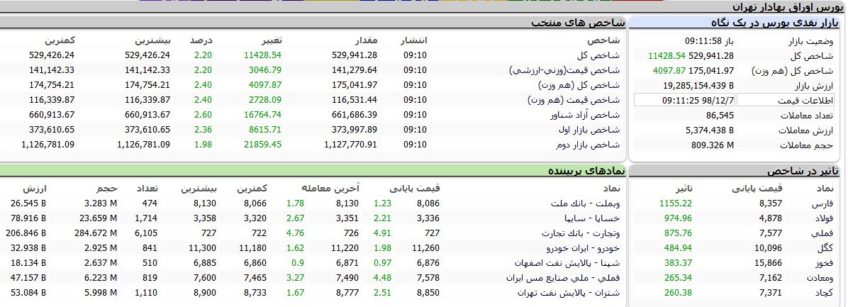 بر اساس این گزارش، این رقم در حالی در تابلوهای آماری تالار شیشه ای به ثبت رسیده است که همه شاخص های اصلی بورس «شاخص کل، شاخص قیمت (وزنی-ارزشی)، شاخص کل (هم وزن)، شاخص قیمت (هم وزن)، شاخص آزاد شناور، شاخص بازار اول و شاخص بازار دوم» به طور میانگین با حداقل ۲ درصد رشد مواجه شده اند.