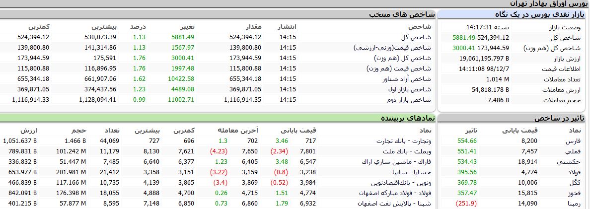 بر اساس آمارهای معاملاتی، روز جاری اکثر شاخصهای بورس با رشد مواجه شدند به طوری که شاخص کل با ۵۸۸ واحد رشد معادل ۱.۱۳ درصد به ۵۲۴ هزار و ۳۹۴ واحد، شاخص قیمت «وزنی - ارزشی» با ۱۵۶۷ واحد افزایش معادل ۱.۱۳ درصد به ۱۳۹ هزار و ۸۰۰ واحد، شاخص کل «هم وزن» با ۳۰۰۰ واحد رشد معادل ۱.۷۶ درصد به ۱۷۳ هزار و ۹۴۴ واحد، شاخص قیمت «هم وزن» با ۱۹۹۷ واحد افزایش، معادل ۱.۷۶ درصد به ۱۱۵ هزار و ۸۰۰ واحد، شاخص آزاد شناور با ۱۰۴۲۲ واحد کاهش، معادل ۱.۶۲ درصد به ۶۵۵ هزار و ۳۴۴ واحد، شاخص بازار اول با ۴۴۸۹ واحد افزایش معادل ۱.۲۳ درصد به ۳۶۹ هزار ۸۷۱ واحد و شاخص بازار دوم با ۱۱۰۰۲ واحد رشد معادل ۰.۹۹ درصد، به یک هزار و ۱۱۶ واحد رسید.