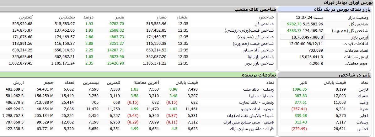 بر اساس آمارهای معاملاتی، روز جاری اکثر شاخصهای بورس با رشد مواجه شدند به طوری که شاخص کل با ۹۷۸۲ واحد رشد معادل ۱.۹۳ درصد به ۵۱۵ هزار و ۵۸۳ واحد، شاخص قیمت «وزنی - ارزشی» با ۲۶۰۸ واحد افزایش معادل ۱.۹۳ درصد به ۱۳۷ هزار و ۴۵۲ واحد، شاخص کل «هم وزن» با ۴۸۸۳ واحد رشد معادل ۲.۸۸ درصد به ۱۷۴ هزار و ۴۶۹ واحد، شاخص قیمت «هم وزن» با ۳۲۵۱ واحد افزایش، معادل ۲.۸۸ درصد به ۱۱۶ هزار و ۱۵۰ واحد، شاخص آزاد شناور با ۱۴۲۸۷ واحد کاهش، معادل ۲.۲۵ درصد به ۶۵۰ هزار و ۳۱۴ واحد، شاخص بازار اول با ۵۸۷۳ واحد افزایش معادل ۱.۶۵ درصد به ۳۶۲ هزار ۸۷ واحد و شاخص بازار دوم با ۲۵۴۲۶ واحد رشد معادل ۲.۳۵ درصد، به یک هزار و ۱۰۵ واحد رسید.