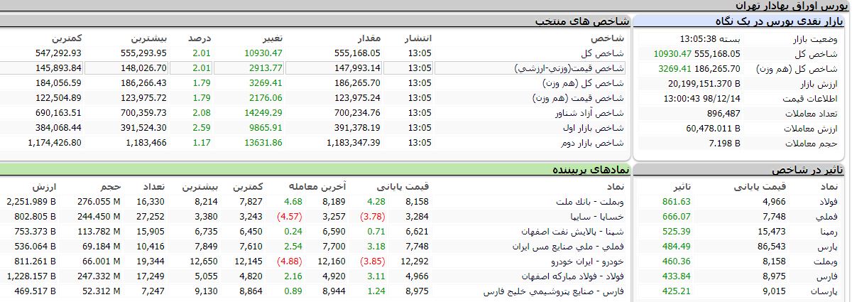 بر اساس آمارهای معاملاتی، روز جاری اکثر شاخصهای بورس با رشد مواجه شدند به طوری که شاخص کل با ۱۰۹۲۷ واحد رشد معادل ۲.۰۱ درصد به ۵۵۵ هزار و ۱۶۵ واحد، شاخص قیمت «وزنی - ارزشی» با ۲۹۱۳ واحد افزایش معادل ۲.۰۱ درصد به ۱۴۷ هزار و ۹۹۲ واحد، شاخص کل «هم وزن» با ۳۲۶۹ واحد رشد معادل ۱.۷۹ درصد به ۱۸۶ هزار و ۲۶۵ واحد، شاخص قیمت «هم وزن» با ۲۱۷۵ واحد افزایش، معادل ۱.۷۹ درصد به ۱۲۳ هزار و ۹۷۵ واحد، شاخص آزاد شناور با ۱۴۲۴۸ واحد کاهش، معادل ۲.۰۸ درصد به ۷۰۰ هزار و ۲۳۳ واحد، شاخص بازار اول با ۹۸۶۲ واحد افزایش معادل ۲.۵۹ درصد به ۳۹۱ هزار ۳۷۴ واحد و شاخص بازار دوم با ۱۳۶۳۱ واحد رشد معادل ۱.۱۷ درصد، به یک هزار و ۱۸۳ واحد رسید.