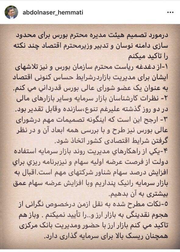 یادداشت اینستاگرامی دکتر همتی درباره محدودسازی دامنه نوسان دربورس