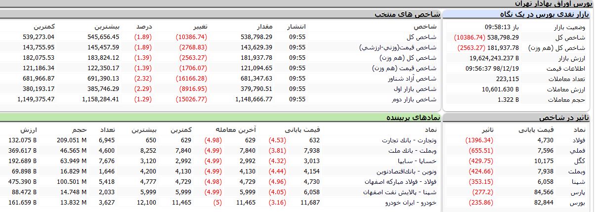 این اتفاق در حالی در بازار سهام رخ داد که شرکت های «فولاد مبارکه اصفهان با (۱۳۹۶) واحد، ملی مس ایران با (۶۵۵) واحد، گل گهر با (۴۲۹) واحد، بانک ملت با (۴۲۴) واحد، پالایش نفت اصفهان با (۳۵۳) واحد، پتروشیمی پارس با (۲۷۷) واحد و بورس تهران با (۲۳۵) واحد» بیشترین تاثیر را در کاهش شدید نماگر تالار شیشه ای را بر عهده داشته اند.