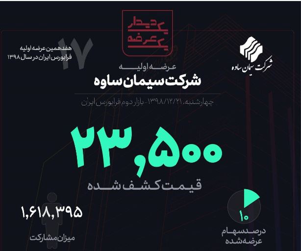 روز جاری نوبت به هفدهمین عرضه اولیه امسال فرابورس رسید که با عرضه بخشی از سهام شرکت سیمان ساوه و کشف قیمت هر سهم این شرکت به ارزش ۲۳ هزار و ۵۰۰ ریال در نماد «ساوه» انجام شد.