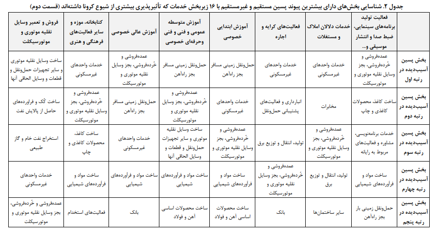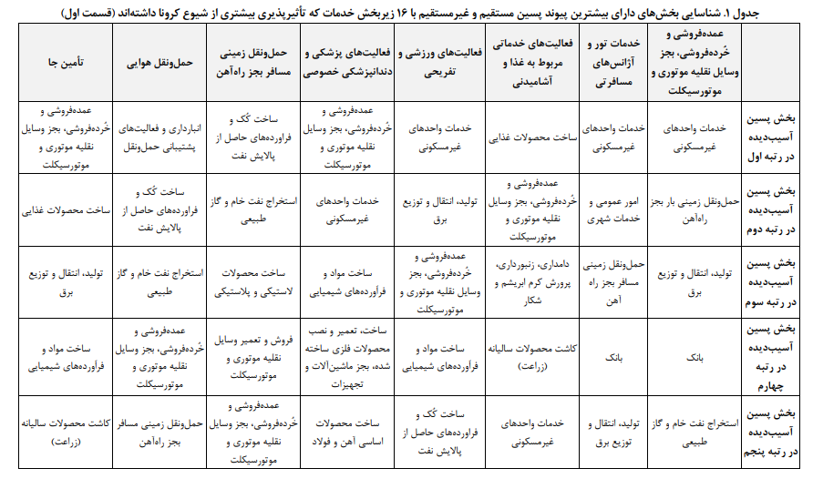 سطر اول جداول نشاندهنده بخشهایی است که به دلیل تعطیلی یا کاهش تقاضا، به طور مستقیم از شرایط فعلی آسیب دیدهاند. سایر سطرهای جدول بهترتیب نشاندهنده بخشهایی است که درنتیجه مشکلِ بخشهای مندرج در سطر اول، با مشکل تقاضا روبهرو خواهند شد.