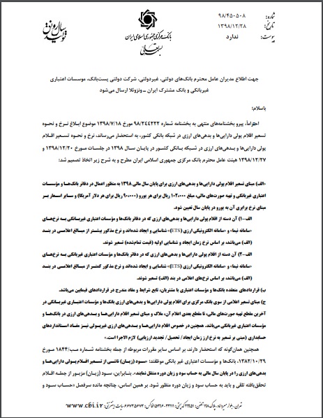 نرخ و نحوه تسعیر اقلام پولی دارایی‌ها و بدهی‌های ارزی برای پایان سال مالی ۹۸ به منظور اعمال در دفاتر بانک‌ها و موسسات اعتباری غیربانکی و تهیه صورت‌های مالی ابلاغ شد.