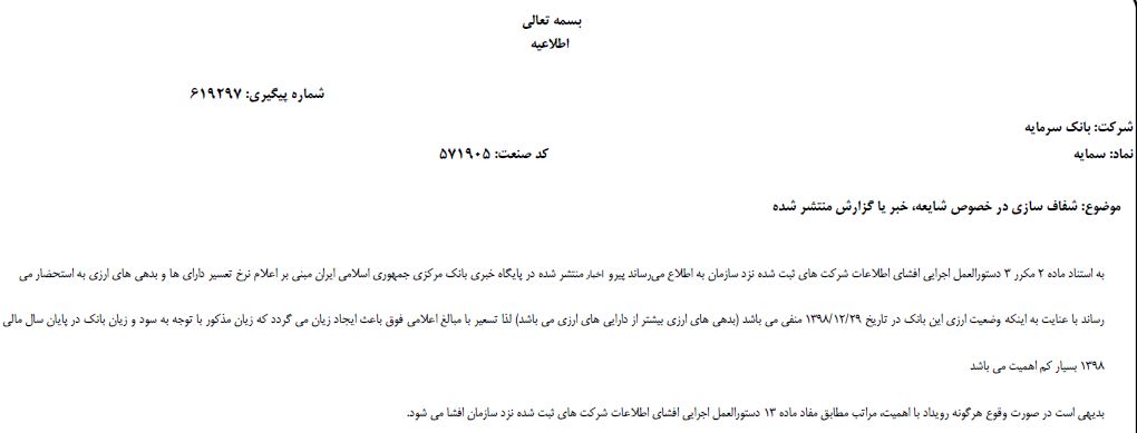 در ادامه شفاف سازی بانک سرمایه آمده که در صورت وقوع هرگونه رویداد با اهمیت، مراتب مطابق مفاد ماده ۱۳ دستورالعمل اجرایی افشای اطلاعات شرکت های ثبت شده نزد سازمان افشا می شود.