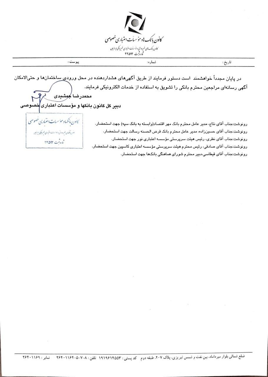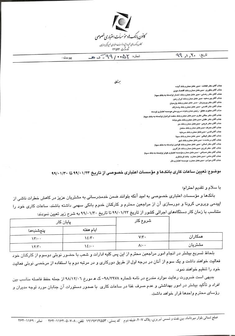 همچنین کانون بانک ها و موسسات اعتباری خصوصی نیز در نامه ای از ساعت کار بانک ها و موسسات اعتباری خصوصی از تاریخ ۲۳ فروردین تا ۳۰ فروردین ۹۹ خبر داد که براین اساس، در طول ایام هفته ساعت کار کارکنان از ۷:۳۰ تا ۱۴:۳۰ و برای مشتریان از ۸:۰۰ تا ۱۴:۰۰ خواهد بود و در روزهای پنجشنبه ۷:۳۰ تا ۱۴:۰۰ برای کارکنان  برای مشتریان ۸:۰۰ تا ۱۲:۳۰ اعلام شده است.