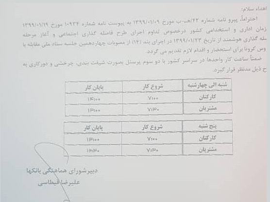 براساس اعلام شورای هماهنگی بانک ها، بانک های دولتی و نیمه دولتی از تاریخ ۲۳ فروردین ۱۳۹۹ با دو سوم پرسنل به صورت شیفت‌بندی، چرخشی و دورکاری از شنبه تا چهارشنبه برای کارکنان از ساعت ۷:۰۰ تا ۱۴:۰۰ و برای مشتریان از ساعت ۷:۳۰ تا ۱۳:۰۰ خواهد بود. همچنین در روزهای پنجشنبه نیز برای کارکنان از ساعت ۷:۰۰ تا ۱۳:۰۰ و برای مشتریان از ساعت ۷:۳۰ تا ۱۲:۳۰ تعیین شده است.