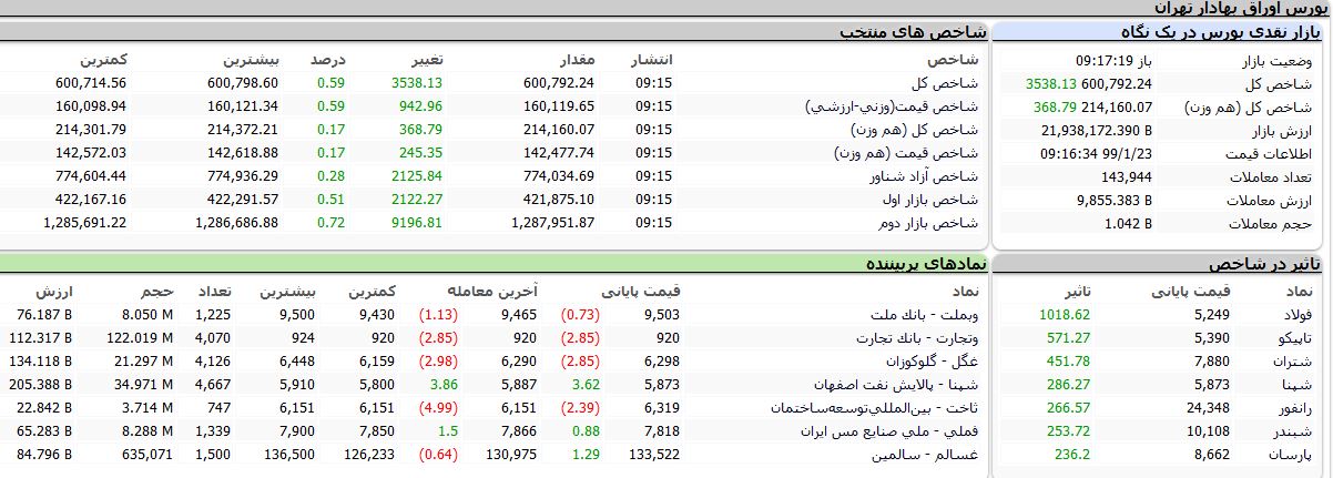 از سویی دیگر آمارهای معاملاتی نشان می دهد که نمادهای « فولاد با ۸۷۵ واحد، تاپیکو با ۷۳۲ واحد، شتران ۶۱۶ واحد، شپنا با ۵۸۱ واحد، رانفور با ۵۷۶ واحد، کچاد با ۵۶۹ واحد، شبندر با ۳۸۳ واحد و پارسان با ۵۶۵ واحد» بیشترین تاثیر را در رشد نماگر تالار شیشه ای را برعهده داشته اند.
