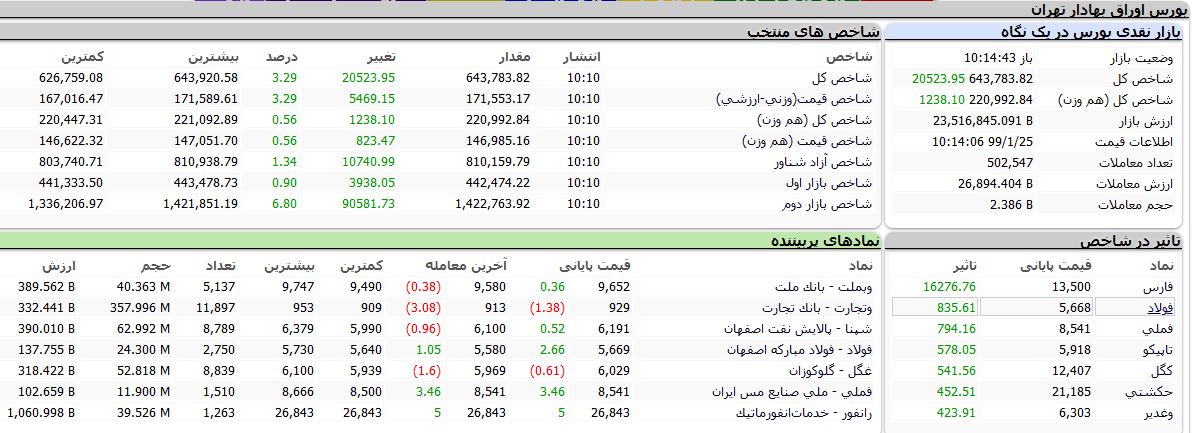 از سویی دیگر آمارهای معاملاتی نشان می دهد که نمادهای « فارس با ۱۶۲۷۶ واحد، فملی با ۸۳۵ واحد، فولاد ۷۹۴ واحد، کگل با ۵۷۸ واحد، تاپیکو با ۵۴۱ واحد، حکشتی با ۴۵۲ واحد و وغدیر با ۴۲۳ واحد» بیشترین تاثیر را در رشد نماگر تالار شیشه ای را برعهده داشته اند.