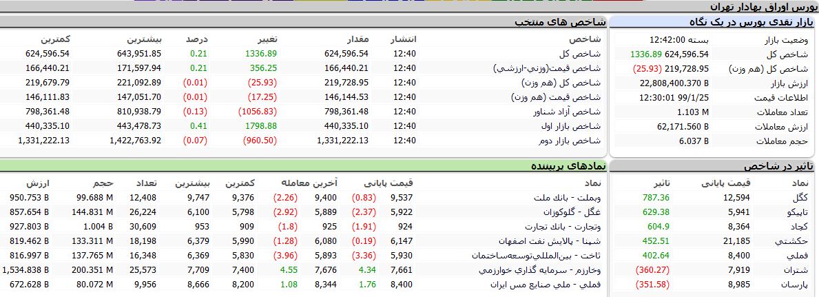 از سویی دیگر امروز ۵ نماد « کگل با ۷۸۷ واحد، تاپیکو با ۶۲۹ واحد، کگل با ۶۰۴ واحد، حکشتی با ۴۵۲ واحد و فملی با ۴۰۲ واحد» رشد، بیشترین تاثیر مثبت را بر شاخص کل بورس بر جای گذاشتند.