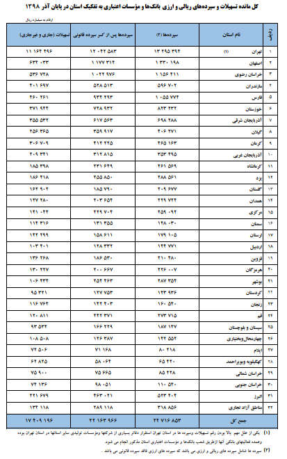 بانک مرکزی توضیح داده است که یکی از علل مهم بالا بودن رقم تسهیلات و سپرده‌ها در استان تهران استقرار دفاتر مرکزی بسیاری از شرکت‌ها و موسسه‌های تولیدی سایر استان‌ها در استان تهران بوده و عمده فعالیت‌های بانکی آنها توسط شعب بانک‌ها و موسسه‌های اعتباری استان تهران انجام می‌شود.